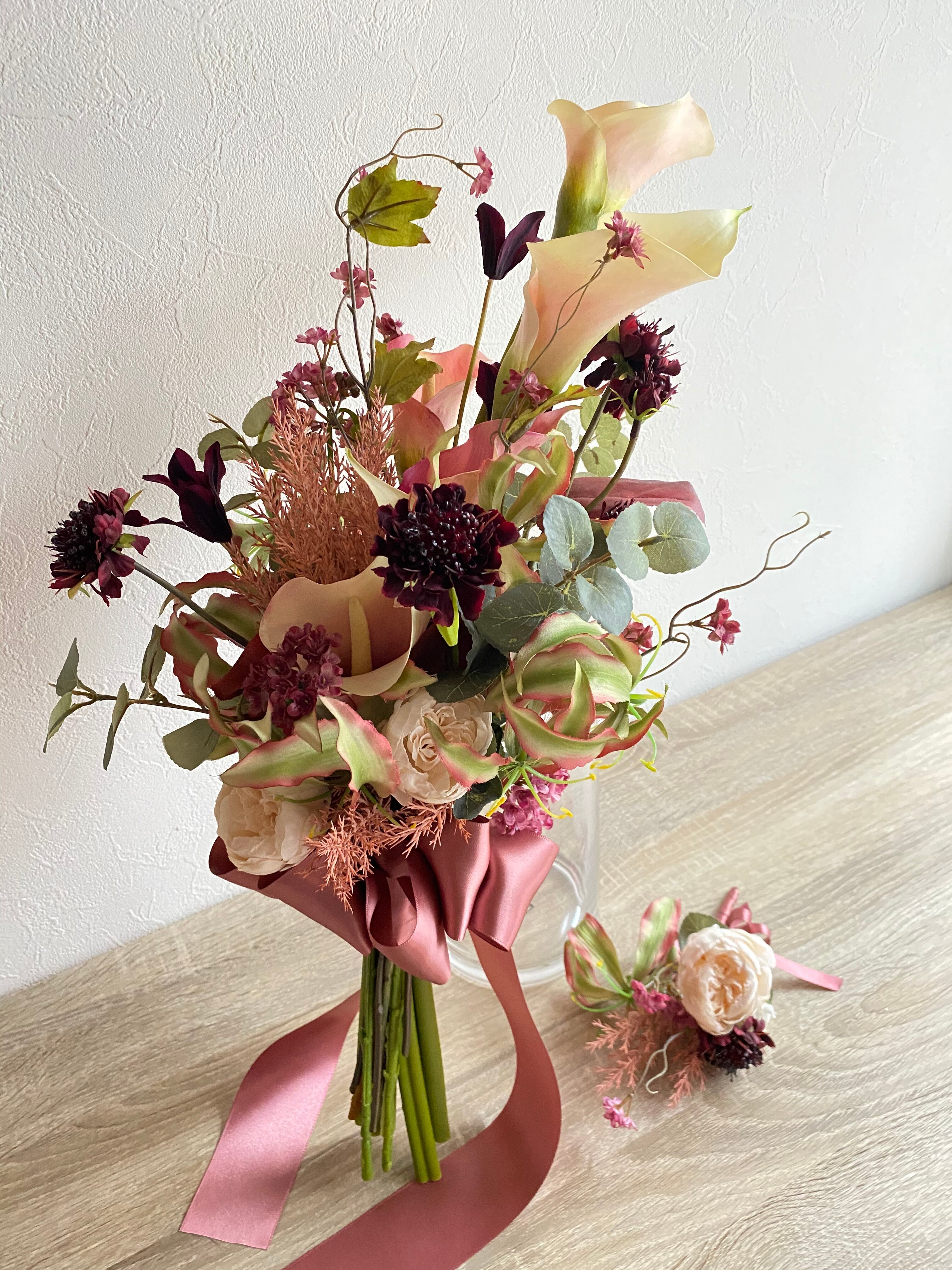 ふわりとしていながらもそれぞれが絡み合い、ドラマチックな雰囲気のアームブーケに仕上げました。色とサイズの異なる2種類のカラーが、ブーケのラインをシャープに見せてくれるので、ドレスはもちろん、和装にも合わせていただけると思います。